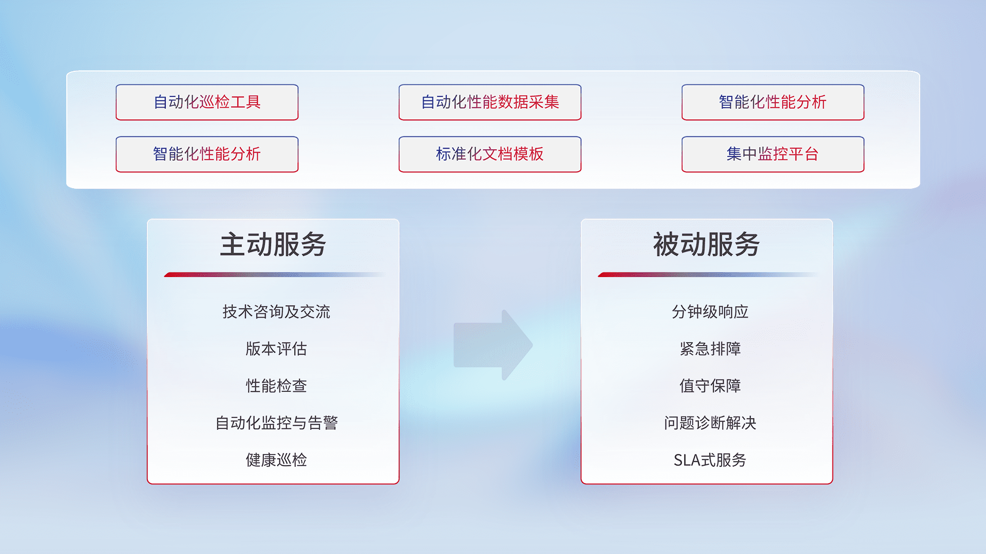 智能化工具和标准化文档,,保障服务质量,,提供主动服务(包含技术咨询、、、版本评估、、、性能检查、、自动化监控与告警、、、健康巡检)和被动服务包含(分钟级响应、、、紧急排障、、、、值守保障、、、问题诊断解决、、、、SLA服务)。。。。